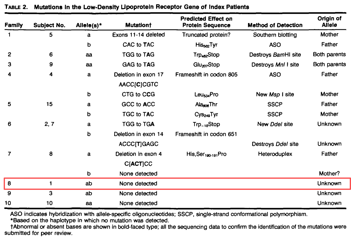1994年,Sun等人在《Arteriosclerosis and Thrombosis》发表了一项关于中国人群家族性高胆固醇血症(FH)的研究,对10个纯合子FH家系进行了LDLR基因突变分析[1]。在该研究的10个家系中,研究者成功鉴定了多数患者的致病突变,但Family 8的Subject No. 1——一位纯合子FH患者——未检出任何LDLR基因突变。