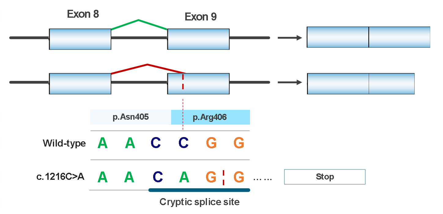 这一发现表明,c.1216C>A(p.Arg406=)在外显子9内部创建了一个新的剪接位点,剪接体优先使用该位点而忽略正常剪接位点,导致成熟mRNA中缺失31个碱基。该缺失造成阅读框移码,将引入提前终止密码子。