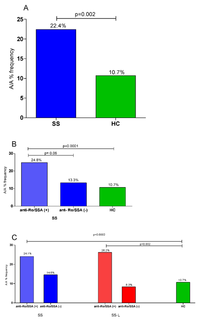 Frequency of the A/A genotype of the IGF1R rs2229765 variant in SS and SS-L patients compared to HCs according to anti-Ro/SSA status.