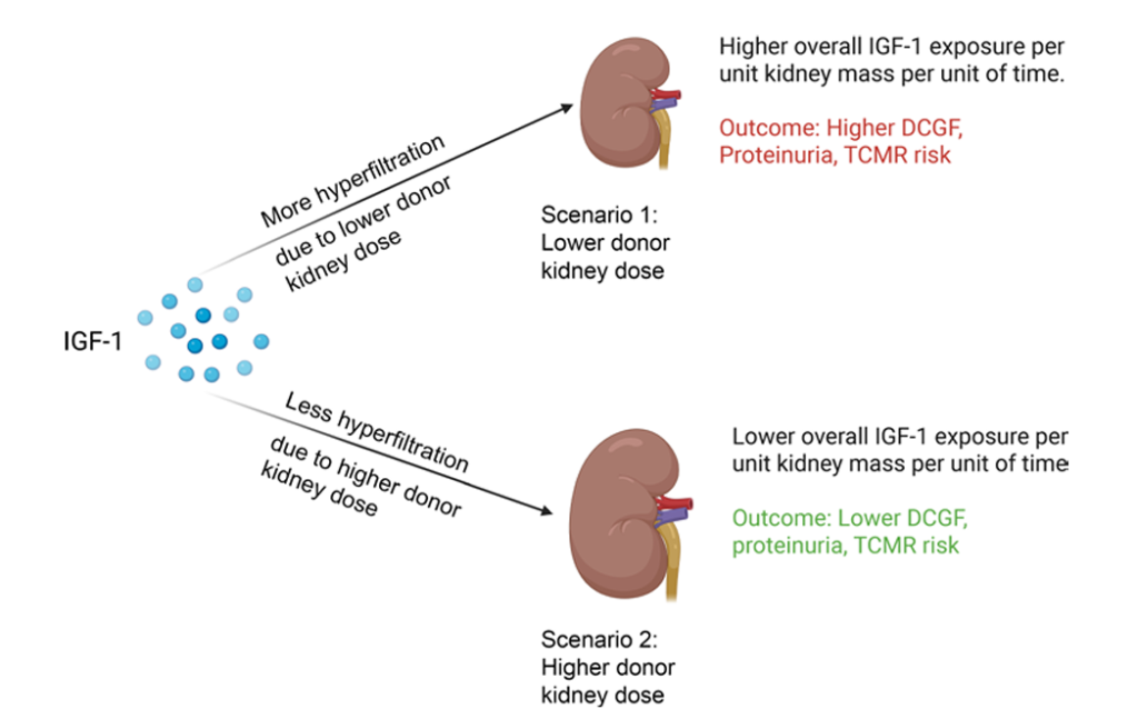 Diagrammatic illustration of how graft IGF-1 exposure is defined by the circulating IGF-1 levels in the recip ient at transplantation with the kidney dose that determines the degree of hyperfiltration