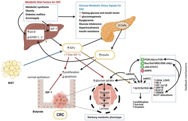 结直肠癌是全球高发恶性肿瘤,代谢综合征(如高血糖)与 CRC 风险升高相关,而 IGF-1 可能是连接高血糖与 CRC 的关键分子——高血糖饮食可通过胰岛素 / IGF-1 信号通路激活结直肠癌细胞的葡萄糖摄取及有氧糖酵解,这一过程涉及 PI3K/Akt/mTORC、Raf/MAPK 通路激活,以及 GLUT1(葡萄糖转运体)、LDHA、HK II(关键糖酵解酶)和 MYC、KRAS(癌基因)的异常调控 [1]。