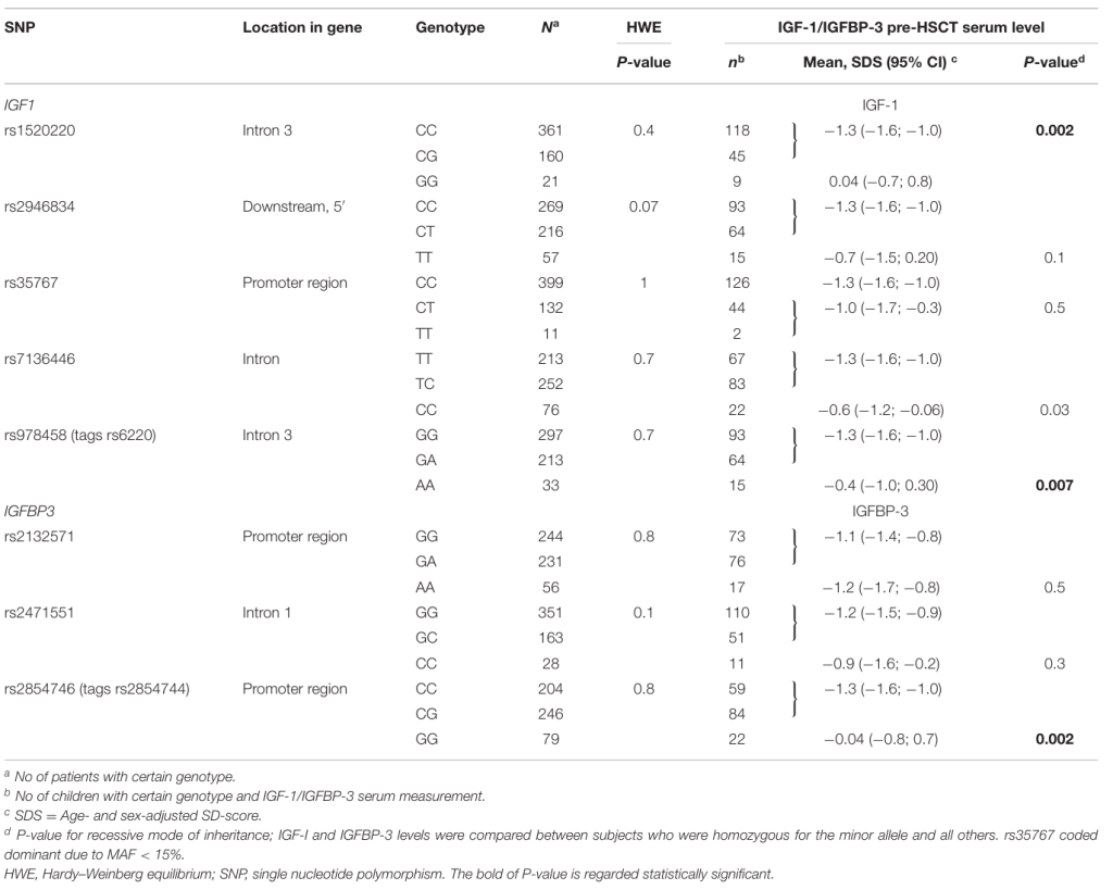 Ebbesen M, Enevold C, Juul A, et al. Insulin-Like Growth Factor Gene Polymorphisms Predict Clinical Course in Allogeneic Hematopoietic Stem Cell Transplantation. Frontiers in Immunology 2020;11.