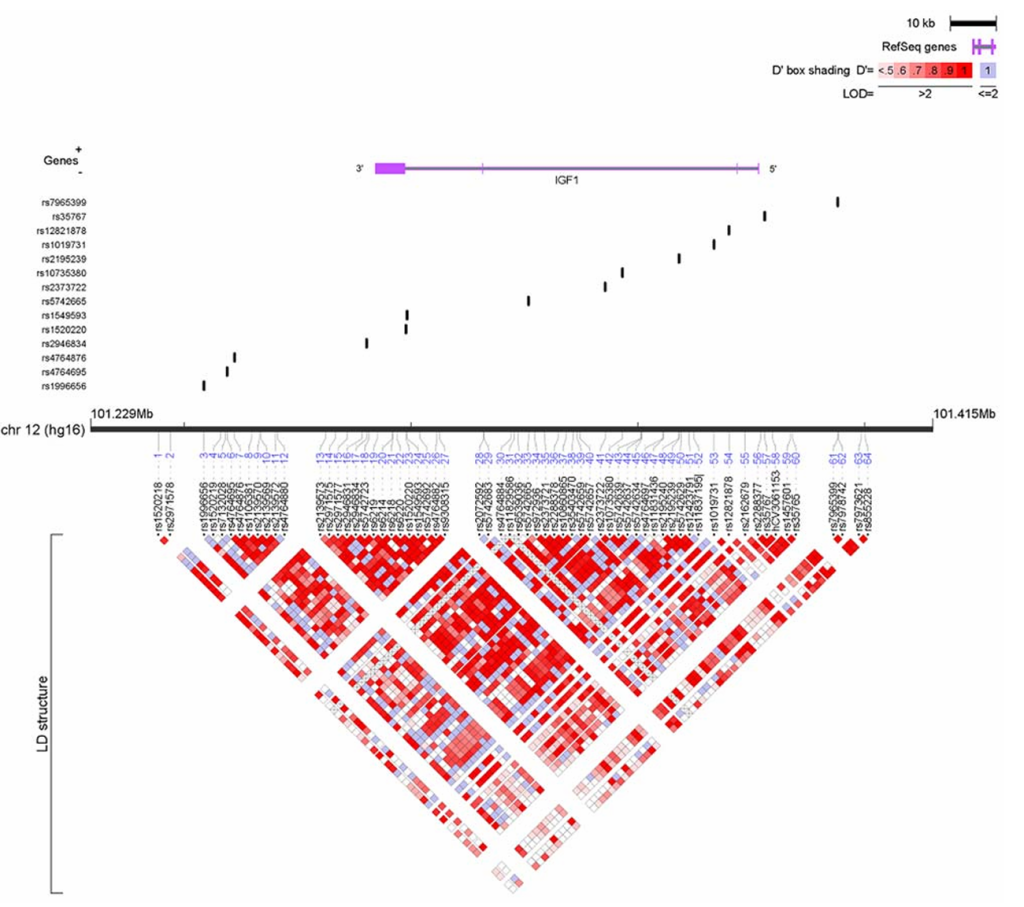 IGF1 SNPs and linkage disequilibrium. 64 SNPs were identified covering a 56-kb region. Of these, 14 htSNPs defined the common haplotypes among Caucasians.