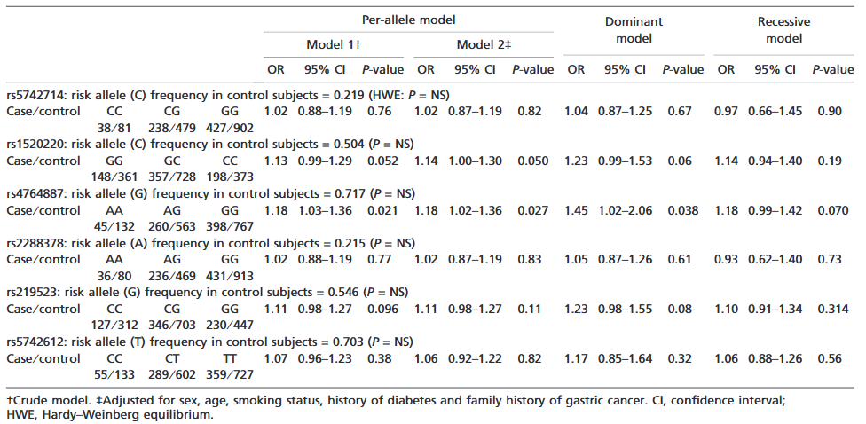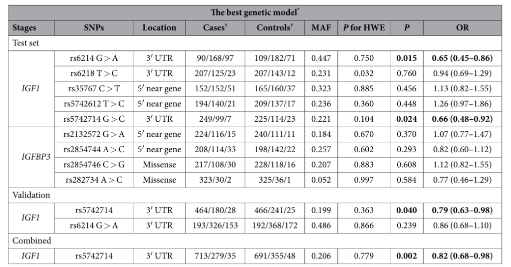 然而,在伊朗人群中,IGF1 rs5742612 多态性与胃癌风险及临床病理特征均无显著关联(P>0.05),且该 SNP 的 T 等位基因频率极低(病例组 1.5%,对照组 1.1%),提示其可能不是该人群胃癌的有效遗传标志物 [40]。