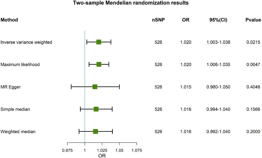 观察性研究已证实循环 IGF-1 水平与 PD 存在线性关联,而孟德尔随机化研究进一步明确其因果关系:通过筛选与 IGF-1 血清浓度及 PD 均相关的 SNP,采用逆方差加权(IVW)法发现,IGF-1 水平每升高 1 个单位,PD 发病风险显著增加(OR=1.020,95% CI=1.003-1.038,P=0.0215);且 MR-Egger 法(P=0.719)及留一法分析均未提示水平多效性或偏倚,证实 IGF1 升高是 PD 的潜在风险因素 [3]。