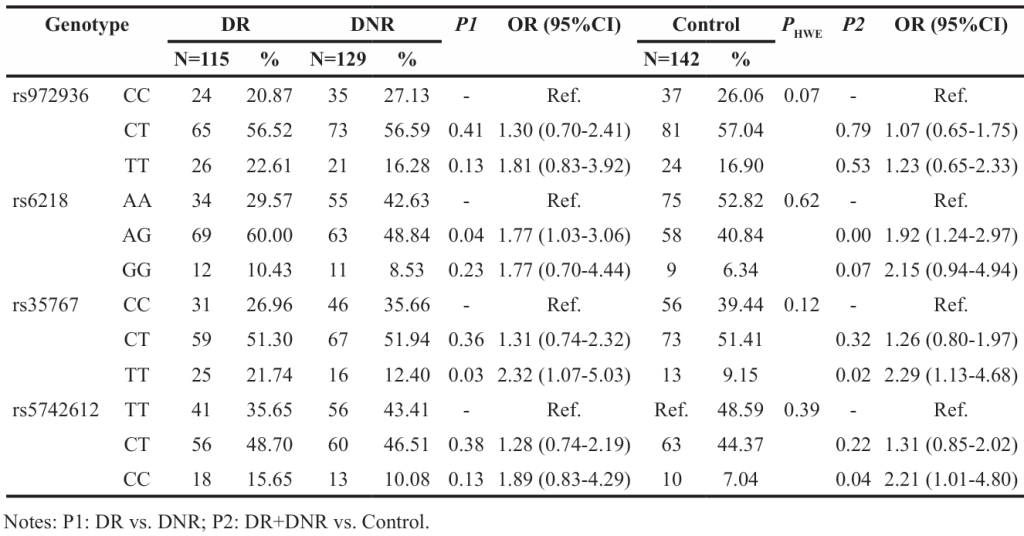 Zhang J, Chen X, Zhang L, Peng Y. Association of IGF1 Gene Polymorphisms with Diabetic Retinopathy Risk in a Han Chinese Population. OncoTarget 2017;8:
