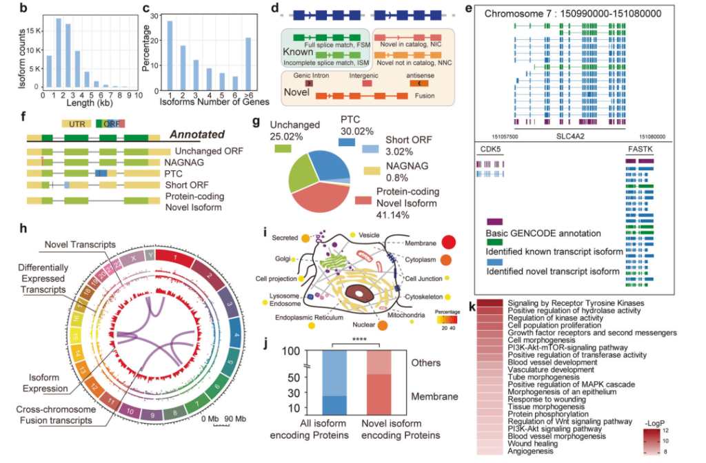 对4例正常胆囊组织、8例GBC组织、4个GBC细胞系和1个永生化胆囊上皮细胞系进行PacBio长读长测序,整合了61,676个全长转录本异构体的注释与表达数据,构建了GBC转录组图谱。该研究还通过短读长测序验证了长读长测序结果,证实其成功构建了胆囊系统的高质量、全面的全长转录本表达数据集。图谱发现了大量新的转录本亚型,其中受体酪氨酸激酶(RTK)家族的转录本具有高度的多样性,尤其是ERBB2基因存在多种可变剪接形式。