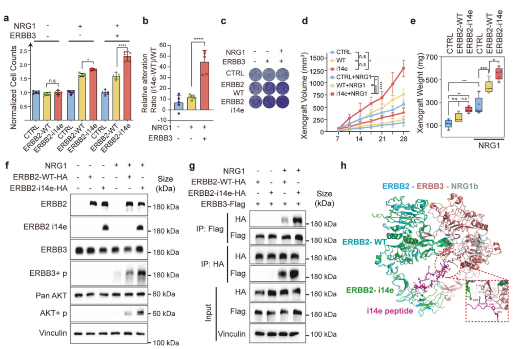 研究结果显示与ERBB3共表达且存在NRG1的情况下,过表达ERBB2 i14e能够激活AKT通路,促进细胞增殖和肿瘤生长。研究结果还显示与野生型ERBB2相比,ERBB2 i14e与ERBB3的相互作用更强。以上结果说明ERBB2 i14e具有更强的与ERBB3相互作用的能力,从而可能激活下游信号级联反应,促进GBC细胞增殖。