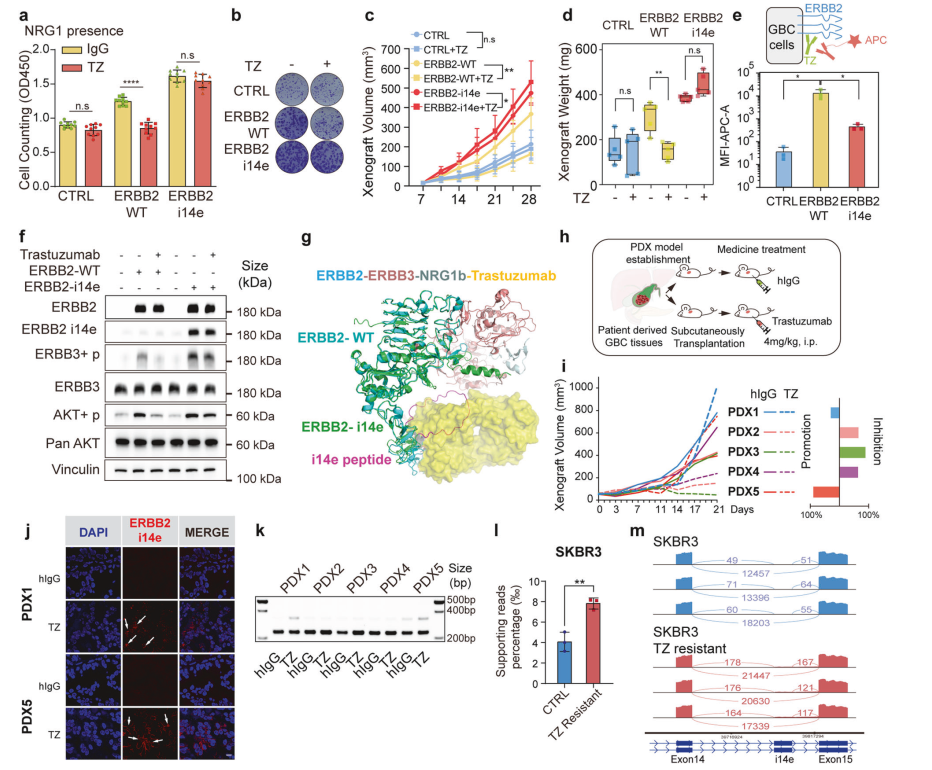 体外细胞实验结果表明,与表达野生型ERBB2相比,表达ERBB2 i14e的细胞对曲妥珠单抗不敏感,且其AKT磷酸化不受抑制,体内异种移植模型也产生了相同的实验结果。