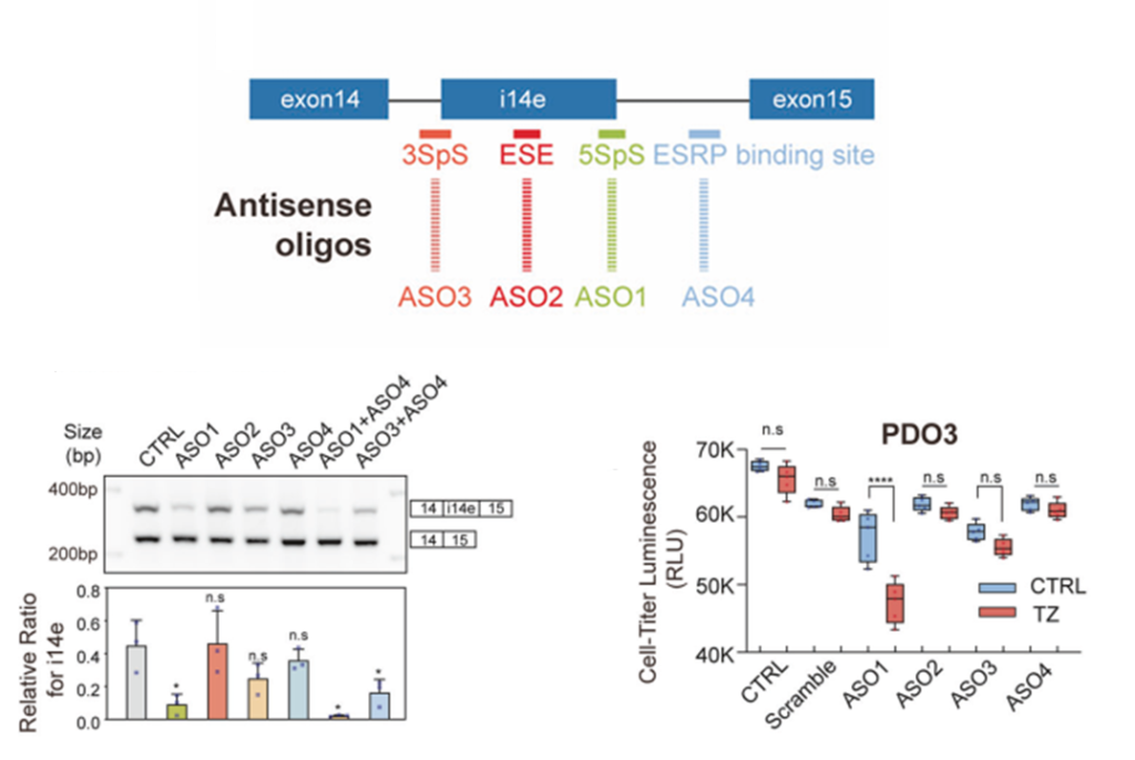 该研究还设计了靶向ERBB2 i14e不同剪接位点的反义寡核苷酸(ASO),靶向5’剪接位点的ASO1对ERBB2 i14e表达抑制效果最强。ASO联合曲妥珠单抗或其偶联药物T-DXd,在体外和体内模型中均能显著抑制肿瘤生长。表明ERBB2 i14e反义寡核苷酸与曲妥珠或曲妥珠-药物偶联物联合治疗,对表达ERBB2 i14e的癌症患者具有巨大的潜在益处。