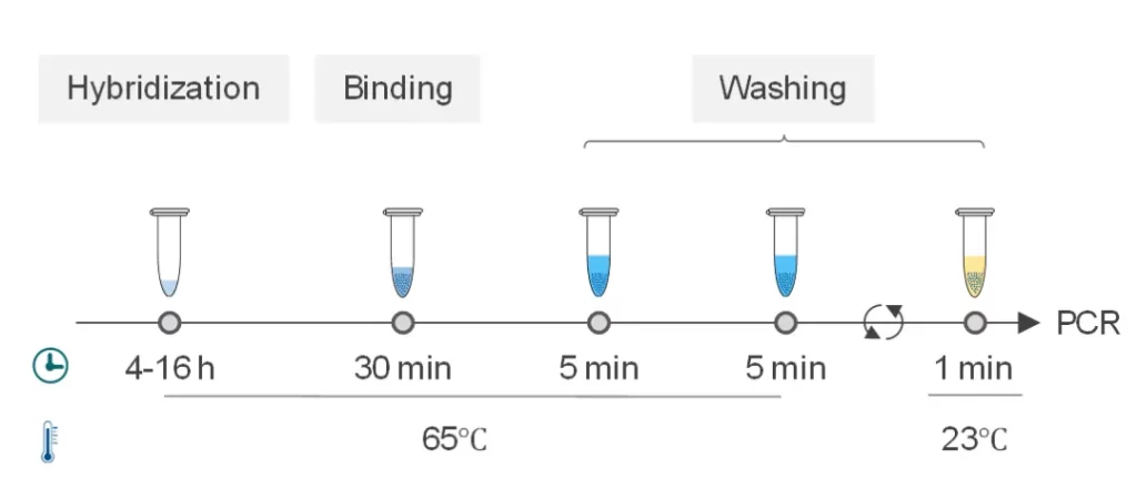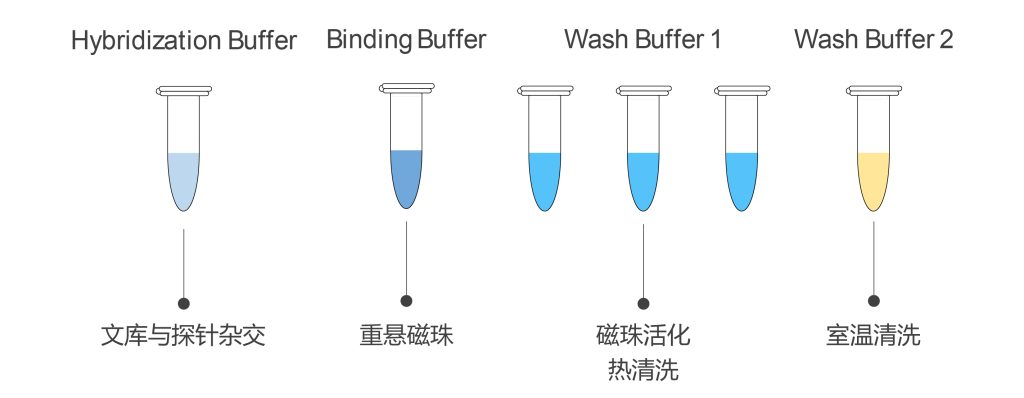 Hyb & Wash Kit v2 推荐4-16 h杂交,杂交完成后,文库-探针与SA Beads结合30分钟,再经过2次热清洗与1次室温清洗,杂交与清洗完成,进入 PCR 步骤。