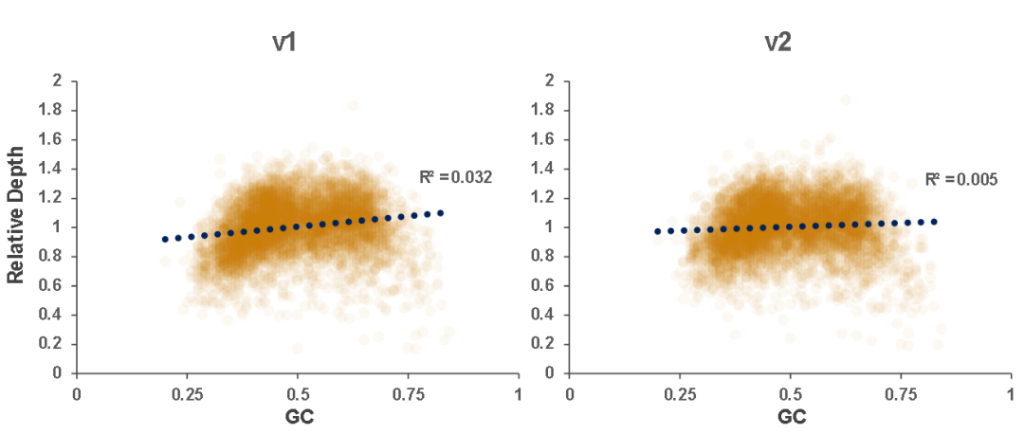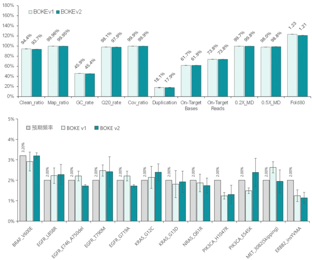 Clean_ratio、Map_ratio等基本参数两款试剂盒表现一致,由于v2试剂盒对低GC目标区域覆盖更佳,其GC_rate率略低于v1。