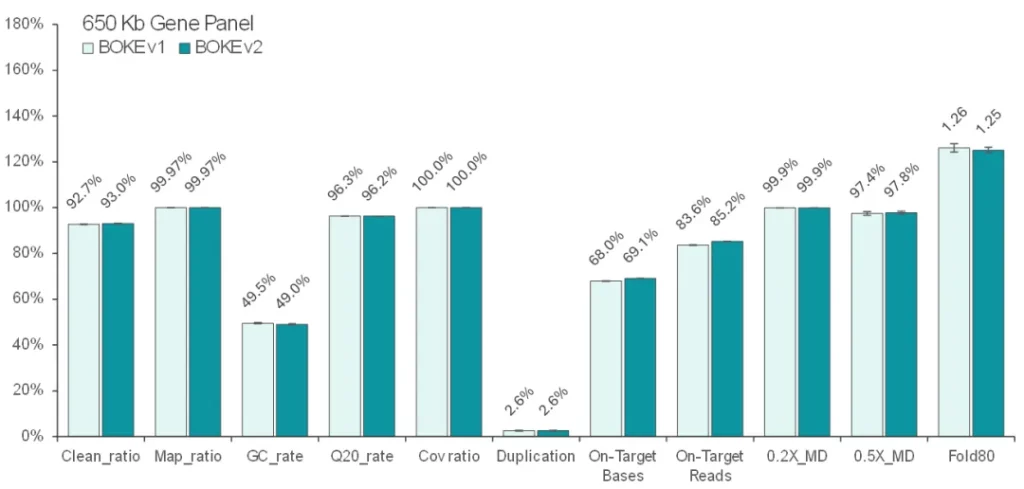 结果显示,在不同大小的Gene Panel中,对于杂交与清洗试剂盒的关键参数-中靶率和均一性,v2与v1试剂盒表现相当,v2试剂盒表现更好的均一性(0.2X_MD、0.5X_MD和Fold80)。
