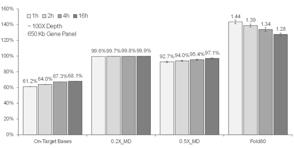 使用650Kb Gene Panel在测序~100X深度下,测试 Hyb & Wash Kit v2 不同杂交时间的表现。如下图所示,中靶率与均一性随杂交时间减少而降低;其中,0.2X_MD始终保持在较高水平,提示短时间杂交在小Panel的胚系变异检测时的应用。鉴于1-2h杂交对0.5X_MD的影响,我们推荐4-16h。伯科将持续开发性能更佳的短时间杂交试剂盒。