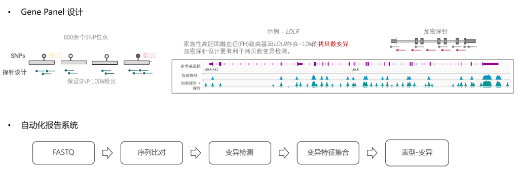 三、Gene Panel设计:对于不同基因变异类型采取针对性的探针设计策略。PRS模块采用多重叠瓦设计,保证覆盖深度均一性,单基因覆盖UTR与外显子,特殊变异类型也进行相应设计,例如具有VNTR的LPA基因以及含有深度内含子变异的MYBPC3采用全基因覆盖、具有CNV变异的LDLR基因对内含子部分进行加密设计。