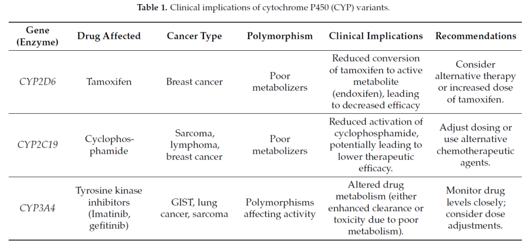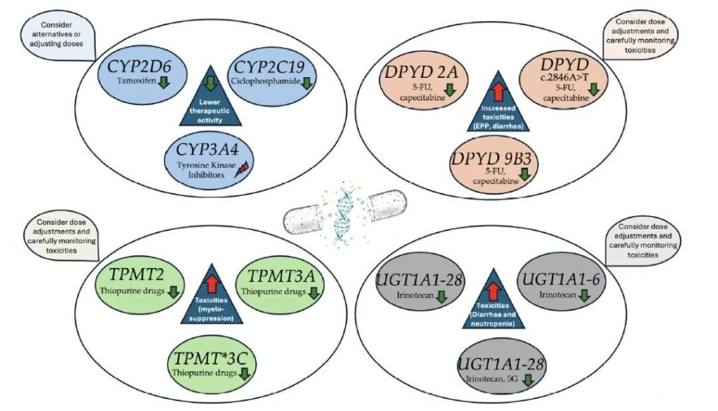 细胞色素 P450 酶、DPYD 和 UGT1A1 等关键基因已被确定为影响他莫昔芬、环磷酰胺、酪氨酸激酶抑制剂、氟尿嘧啶类药物和伊立替康等常用化疗药物代谢的重要生物标志物,进而导致患者治疗结局存在差异。