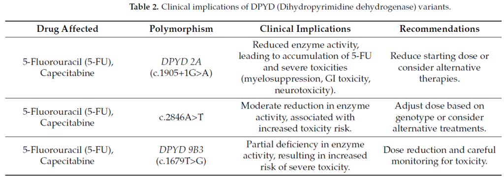由于存在显著风险,包括欧洲肿瘤内科学会(ESMO)和临床药物基因组学实施联盟(CPIC)在内的多个健康组织建议在治疗前对 DPYD 多态性进行基因检测,以识别高风险患者。