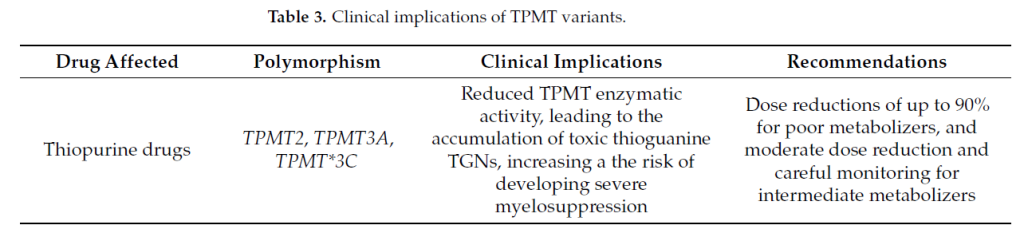 特征最明确的 TPMT 多态性包括: TPMT2、TPMT3A 和 TPMT*3C。这些遗传变异导致 TPMT 酶活性降低,使得接受标准剂量硫嘌呤类药物治疗的患者体内毒性硫鸟嘌呤核苷酸(TGNs)蓄积。个体可分为正常代谢者(野生型)、中间代谢者(低功能变异杂合子)或弱代谢者(低功能变异纯合子)。