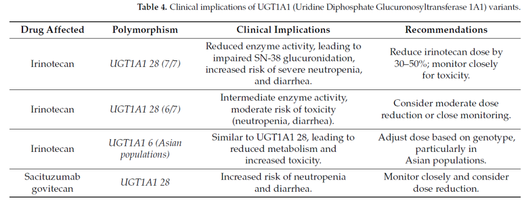 多个专业指南(包括临床药物基因组学实施联盟(CPIC)和欧洲药品管理局(EMA)的指南)建议在治疗前进行 UGT1A1 基因分型,尤其是对于接受高剂量(≥250 mg/m²)伊立替康治疗的患者。