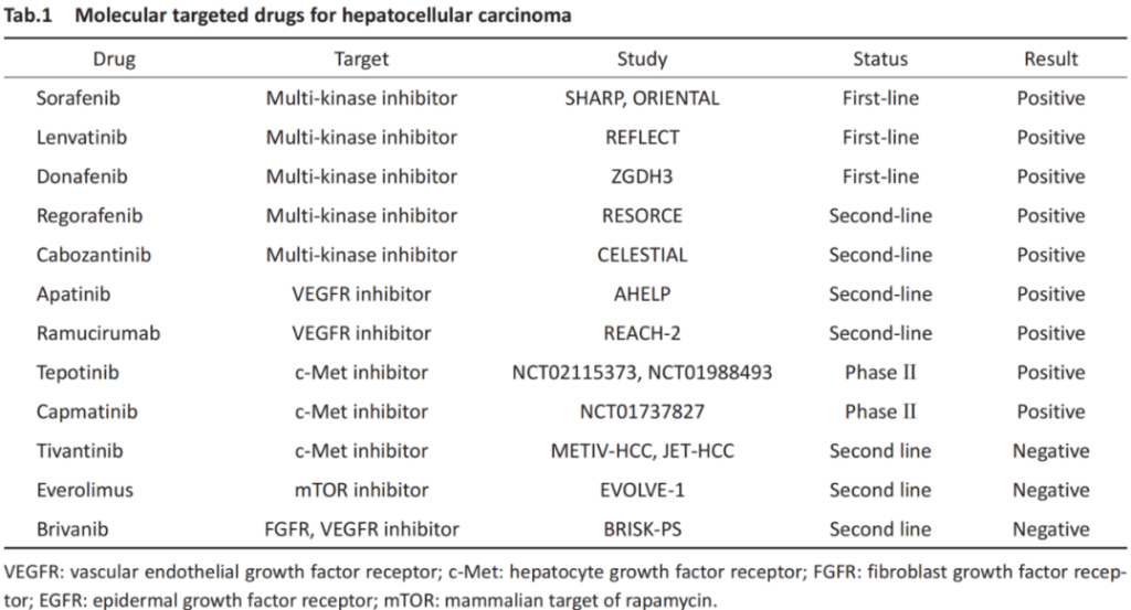 17.Niu M, Yi M, Li N, Wu K, Wu K. Advances of Targeted Therapy for Hepatocellular Carcinoma. Front Oncol. 2021 Jul 26;11:719896.