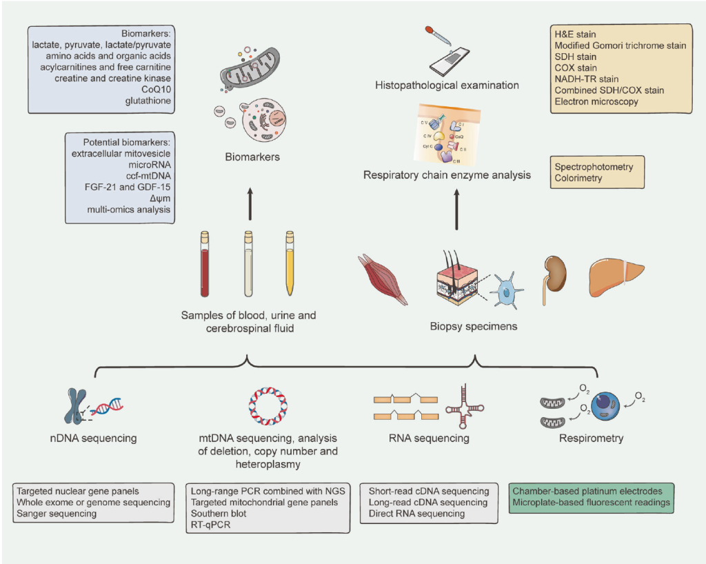 怀疑线粒体疾病时,应首先对血液、尿液和脑脊液进行生化检测;然而,尚无完美的诊断方法;诊断非典型和新型线粒体遗传疾病,需审慎结合多种诊断手段。此外,必须强调临床观察与实验室检查结合的重要性 —— 这种关联是准确诊断的关键。