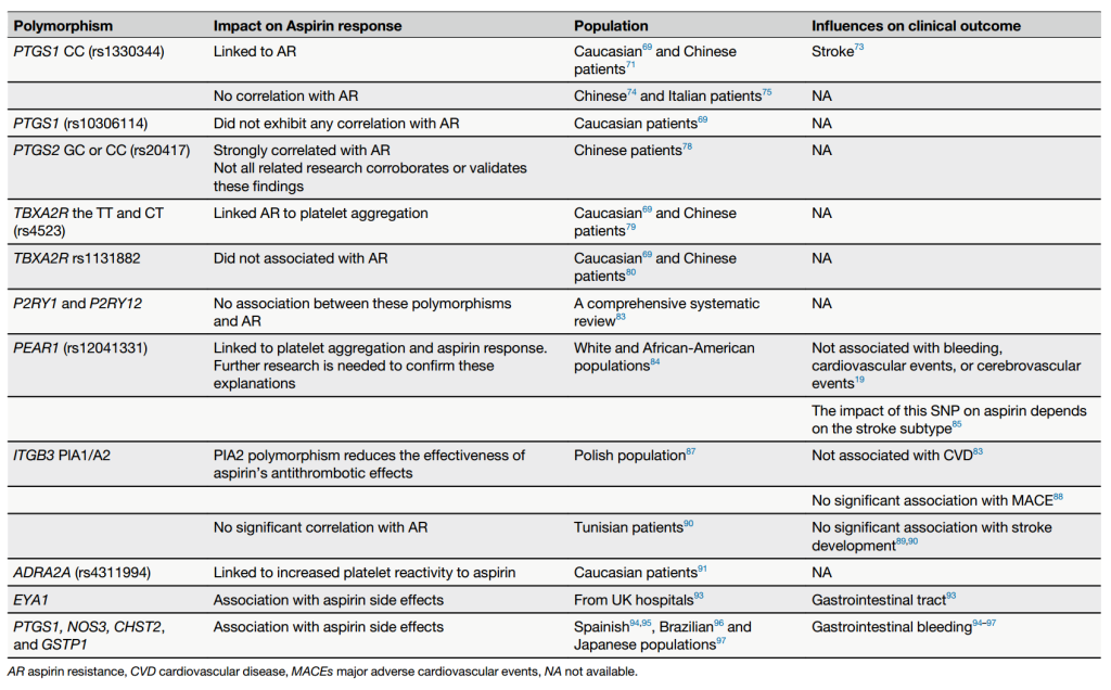 Li CX, Sun LC,et al. The associations of candidate gene polymorphisms with aspirin resistance in patients with ischemic disease: a meta-analysis. Hum Genomics. 2024 Dec 2;18(1):135.