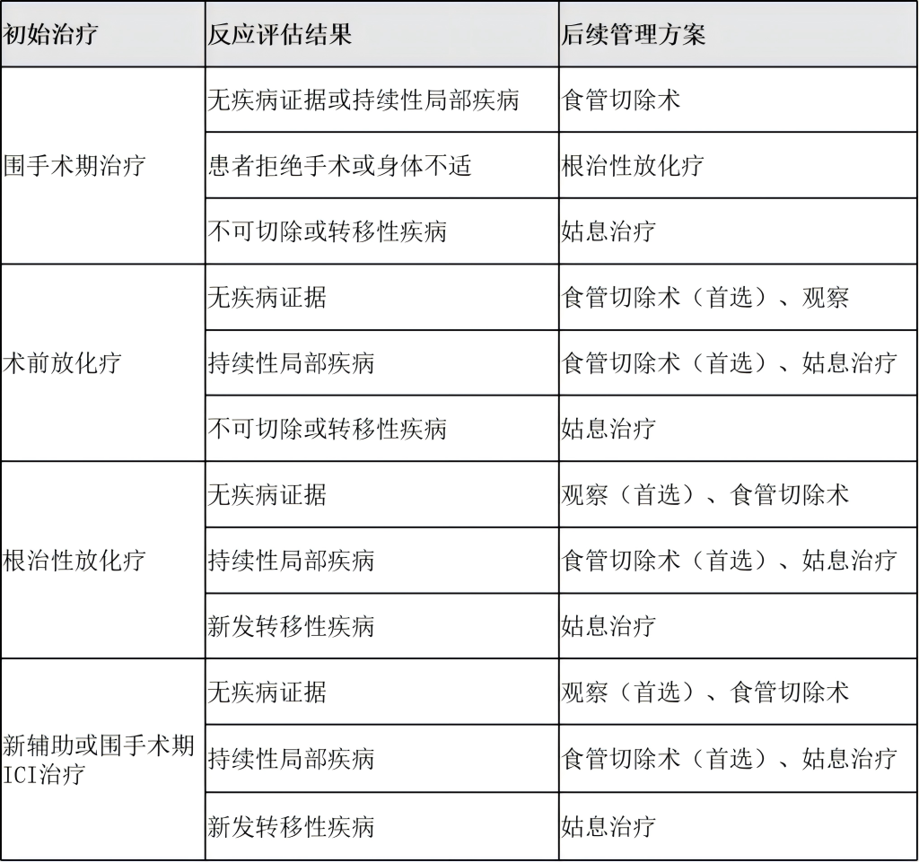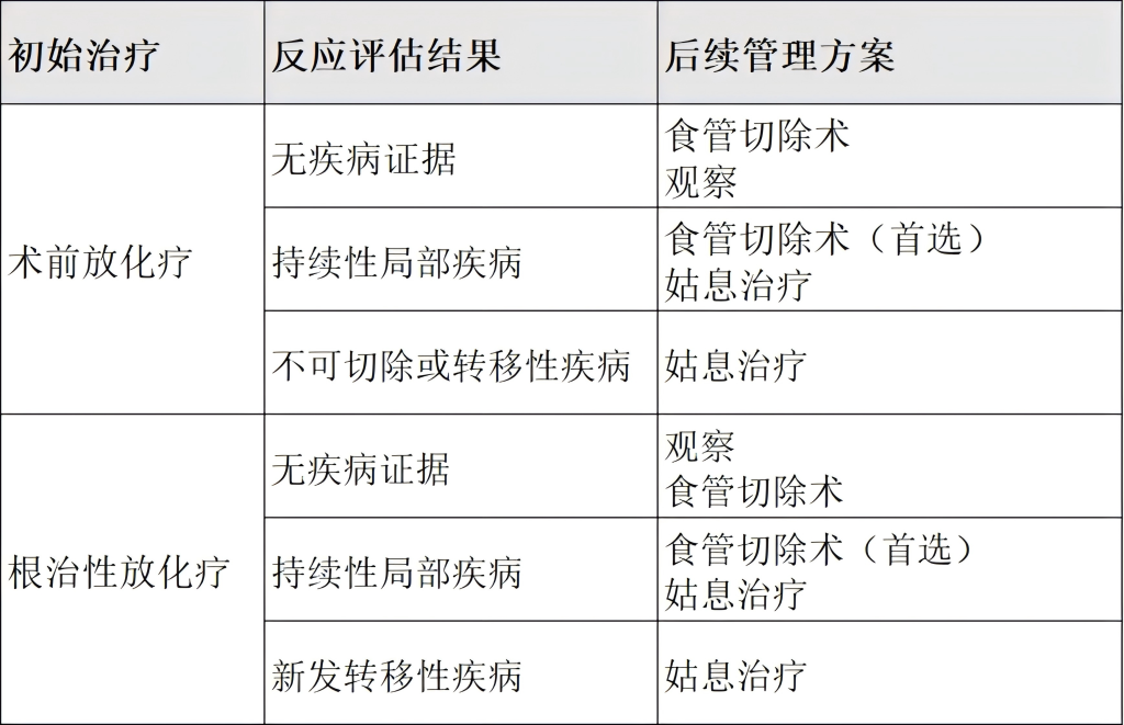 局部复发(既往放化疗,既往无食管切除术):若可切除且可进行医学手术,进行食管切除术,后续通过胸/腹增强CT评估治疗反应,若再次复发,则进行姑息治疗;若不可切除或医学上不可手术,进行姑息治疗。