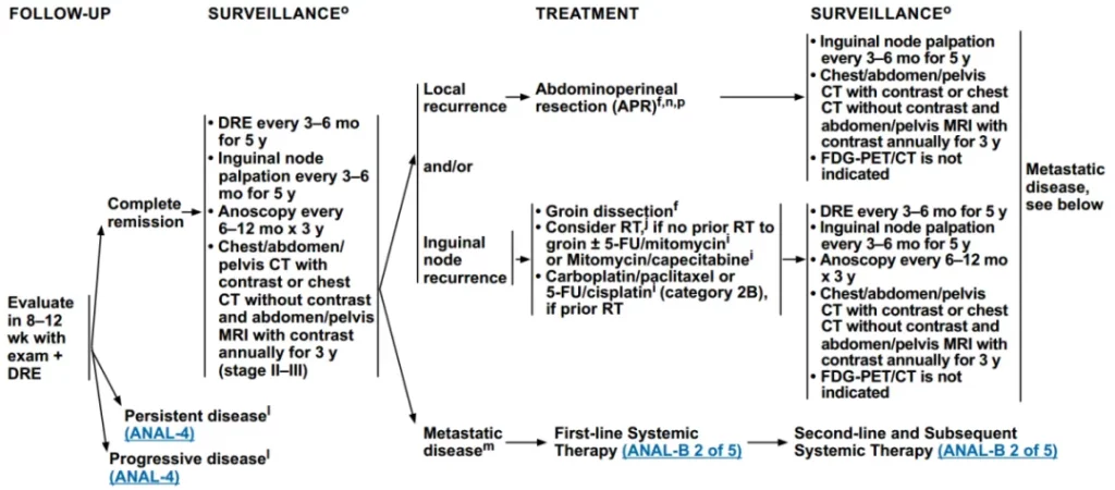 DRE每3-6个月一次,持续5年;腹股沟淋巴结触诊每3-6个月一次,持续5年;肛门镜检查每6-12个月,持续3年;胸部/腹部/骨盆CT(有造影剂)或胸部CT(无造影剂)和腹部/骨盆MRI(有造影剂),每年一次,持续3年(II-III期)。