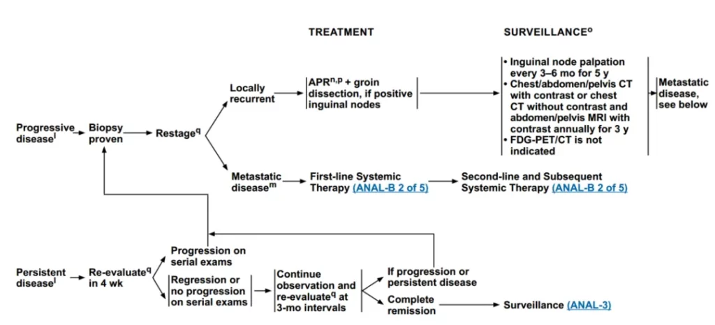 局部复发,如果是腹股沟淋巴结阳性,进行APR+腹股沟解剖;后进入监测阶段:腹股沟淋巴结触诊,每3-6个月一次,持续5年;胸部/腹部/骨盆CT(有造影剂)或胸部CT(无造影剂)和腹部/骨盆MRI(有造影剂),每年一次,持续3年;FDG-PET/CT不适用。