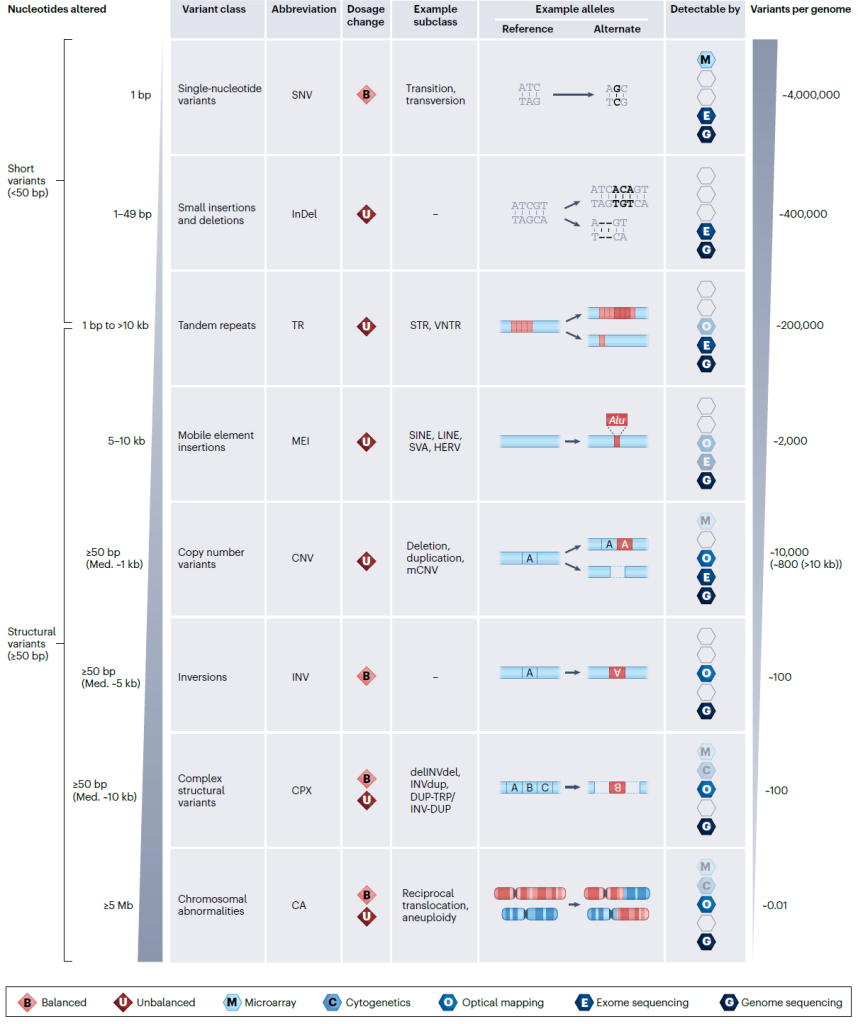 SVs在人类群体中普遍存在,其突变机制具有异质性;包括拷贝数变异(CNVs,缺失 / 重复)、插入(移动元件插入(如长散在核元件 1(LINE1)和短散在核元件(Alu))、新的非参考序列插入(如病毒 DNA 插入)、线粒体 DNA 的核插入,以及串联重复序列扩张(例如,短串联重复序列(STRs,重复单元为 1-10 bp)和可变数目串联重复序列(重复单元为 10-100 bp))、倒位、易位(导致基因组重排但不改变拷贝数的结构变异)及复杂结构变异(如染色体重生),是人类基因组核苷酸多样性的主要来源(平均每基因组改变 32.1 Mb,远超短变异的 6.7 Mb)。