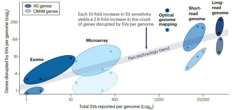 相比于参考基因组,人类平均每个基因组中存在数千个结构变异,但每个基因组中识别出的结构变异具体数量与类型,取决于用于检测结构变异的技术与算法。