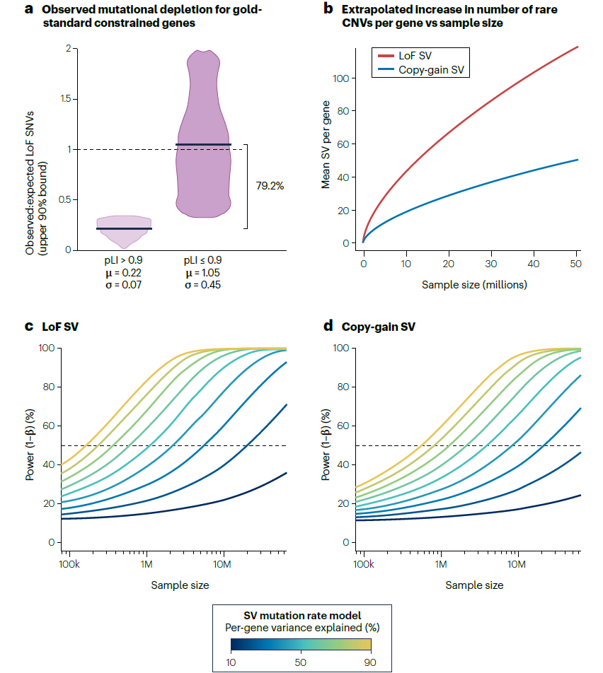 第一,整合海量基因组数据集与分布式计算技术,训练统计或机器学习模型,明确基因组特征与结构变异发生的关联,确定结构变异高频发生的基因组语境;第二,由于人类生殖细胞新生结构变异发生率低(每代不足 1 个),需建立 “中性结构变异筛选标准”(类似同义短变异),以完善突变率模型参数;最后,需扩大样本量以构建全面的剂量敏感性图谱,例如基于现有基因组聚合数据库(gnomAD)数据估算,需至少 10 万个样本才能使结构变异推导的单倍体不足 metrics 精度媲美短变异。