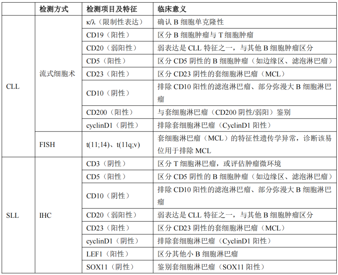 由于CLL与SLL检测标本类型(CLL:外周血;SLL:淋巴结组织)有所不同,故使用检测技术不同。另外,SLL需要排除淋巴结里形态相似的其他小B细胞淋巴瘤,因此其免疫组化检测中增加了LEF1和SOX11等标志物,以确保与其他小B细胞淋巴瘤的精准区分。
