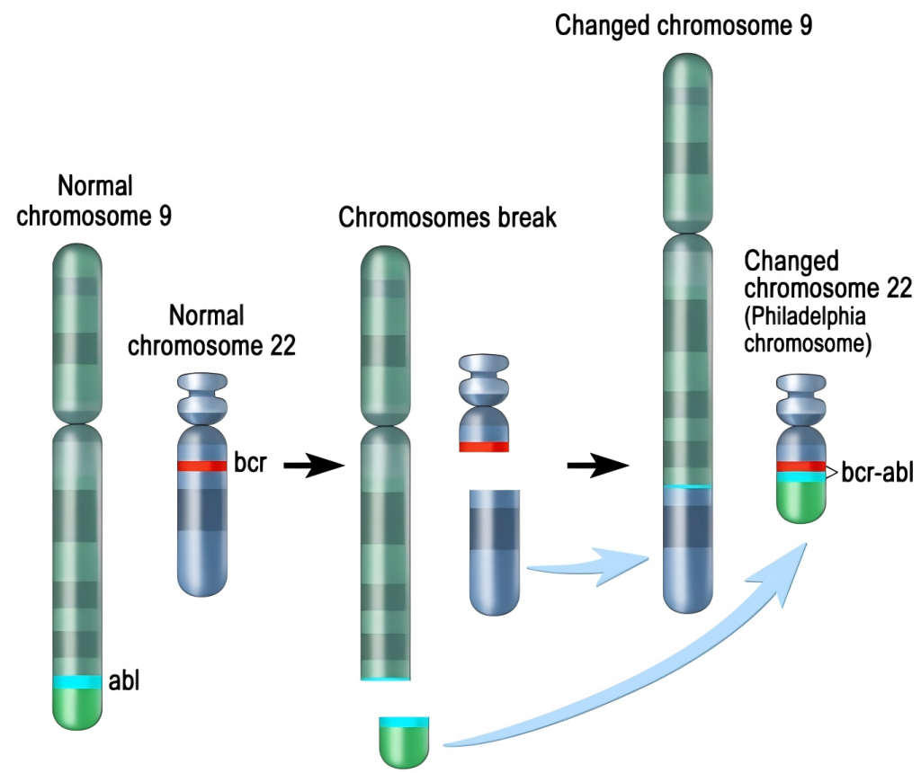 由9号染色体与22号染色体发生易位形成,具体表现为t(9;22)(q34;q11.2),即9号染色体长臂末端(9q34)与22号染色体长臂(22q11.2)断裂后,断片相互交换位置并重新连接,形成一条异常的22号染色体(der(22)t(9;22))。易位导致9号染色体上的原癌基因ABL与22号染色体上的断裂点簇集区基因BCR融合,形成BCR-ABL融合基因。