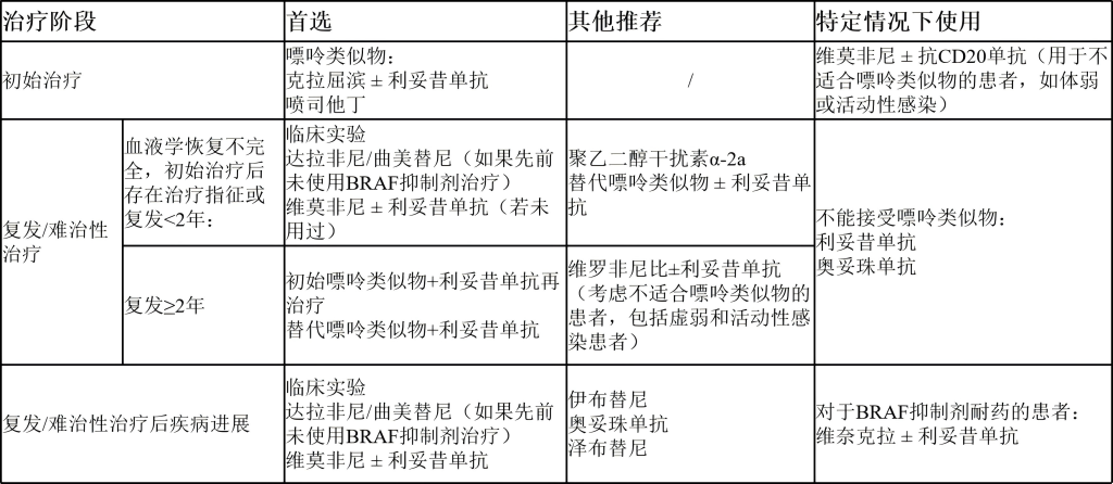 目前毛细胞白血病的治疗以药物治疗为主,手术治疗仅在极少数特殊情况下考虑。治疗方案分为初始治疗和复发难治性治疗,核心药物包括嘌呤类似物、单克隆抗体、BRAF抑制剂等。