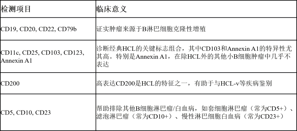 3.免疫分型:通过流式细胞术或免疫组织化学(IHC)检测细胞表面标志物,是区分经典毛细胞白血病(cHCL)与毛细胞白血病变异型等其他相似疾病的关键。
